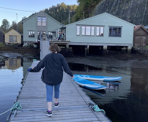 Vi går ut på brygga og over i badstua for en omvisning. Innvendig er veggene preget med sitater og kunst. Lars Magne forklarer at tekstene er laget i samarbeid med ungdomsskoleelever og Montessori-skoleelever som holder til her på Hosanger.