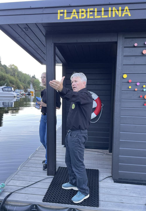 – I 2019 kom kona mi på en idé, og resultatet ser du der, sier han og peker på et lite bygg uti vannet hvor det står Flabellina på et skilt. Det er den eneste flytende og flyttbare kunstbadstuen i hele universet, hevder han.