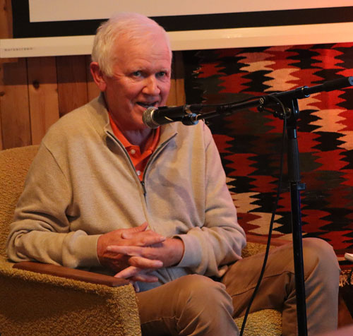 Staalesen snakket bl.a. om hans siste bok «Forfulgt av død», hvor Varg Veum får førerkortet sitt beslaglagt. Det er inspirert av en virkelig historie, som vi fikk høre om. Han snakket også om sin historiske Bergenstrilogi, som ble til fire bøker.