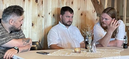 Vi går ut på brygga og over i badstua for en omvisning. Innvendig er veggene preget med sitater og kunst. Lars Magne forklarer at tekstene er laget i samarbeid med ungdomsskoleelever og Montessori-skoleelever som holder til her på Hosanger.