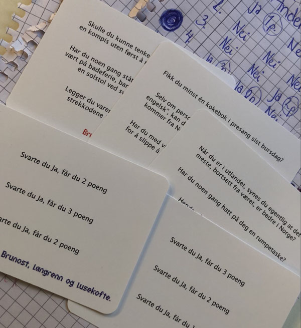 Vi som spilte var Mona, Adrian og meg. Adrian var den som ble mest typisk norsk. Vi synes at det var et morsomt spill - som også gir rom for diskusjoner rundt spørsmålene og svarene. Konseptet og reglene er veldig enkle og forstå, og man kan spille så lenge man vil - eller iallefall så lenge det er ubrukte spørsmål.
